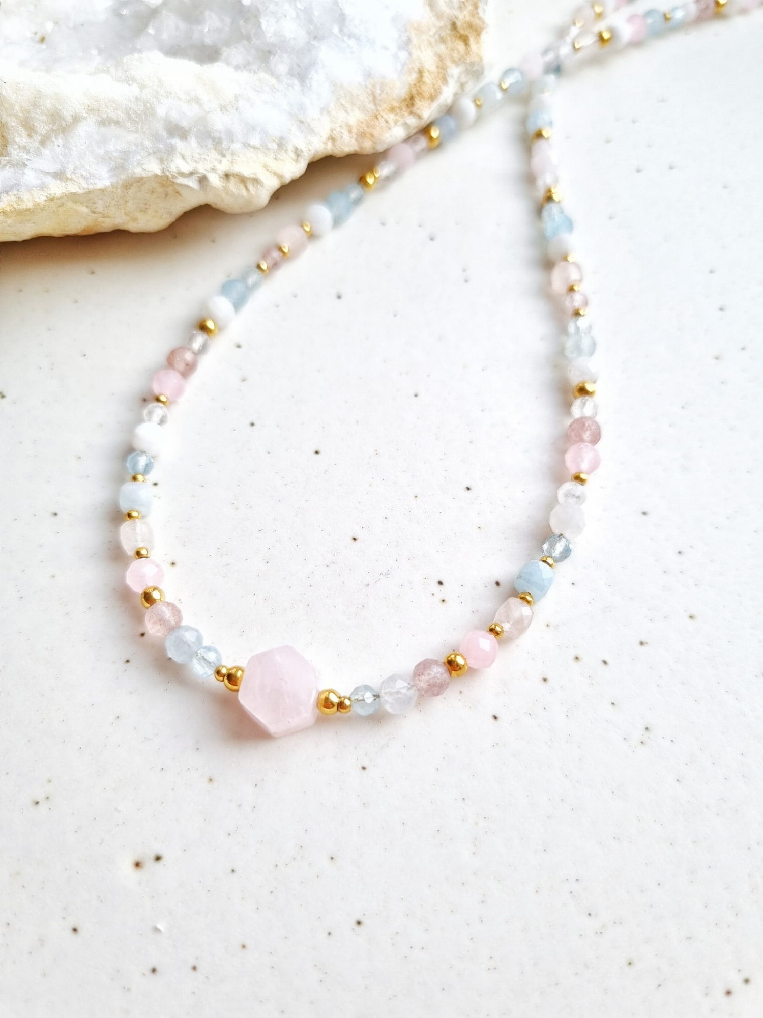 Noszenie kwarcu różowego w formie biżuterii, na przykład jako naszyjnik, pozwala jego energii stale oddziaływać na nasze centrum energetyczne serca. To nie tylko piękna ozdoba, ale także potężny amulet, który otwiera serce i przyciąga pozytywną energią. Kwarc różowy pomaga również budować i wzmacniać relacje, wprowadzając do nich więcej harmonii i zrozumienia. Jeśli pragniesz przyciągnąć do swojego życia więcej miłości lub uzdrowić swoje serce, ten piękny kryształ jest dla Ciebie. Pozwól, aby ten niezwykły kamień przypominał Ci każdego dnia, że jesteś godna miłości.