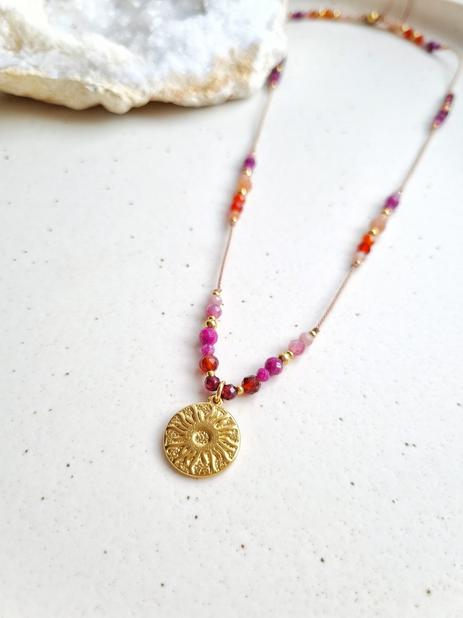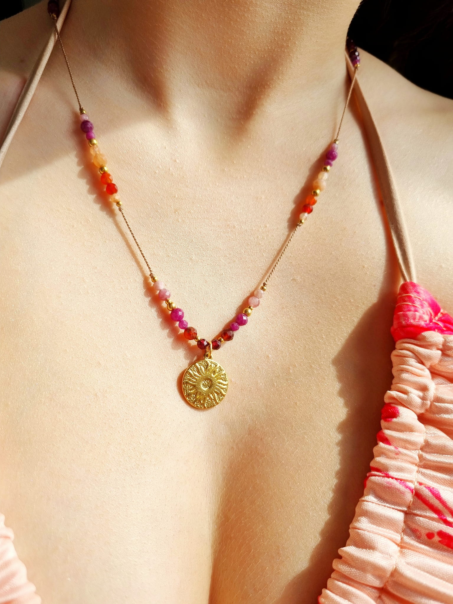 NASZYJNIK Z KAMIENI NATURALNYCH GRANATU, KARNEOLU, RUBINU, KAMIENIA SŁONECZNEGO I KRYSZTAŁU GÓRSKIEGO - ZAWIESZKA SŁOŃCE - STAL CHIRURGICZNA ZŁOTA