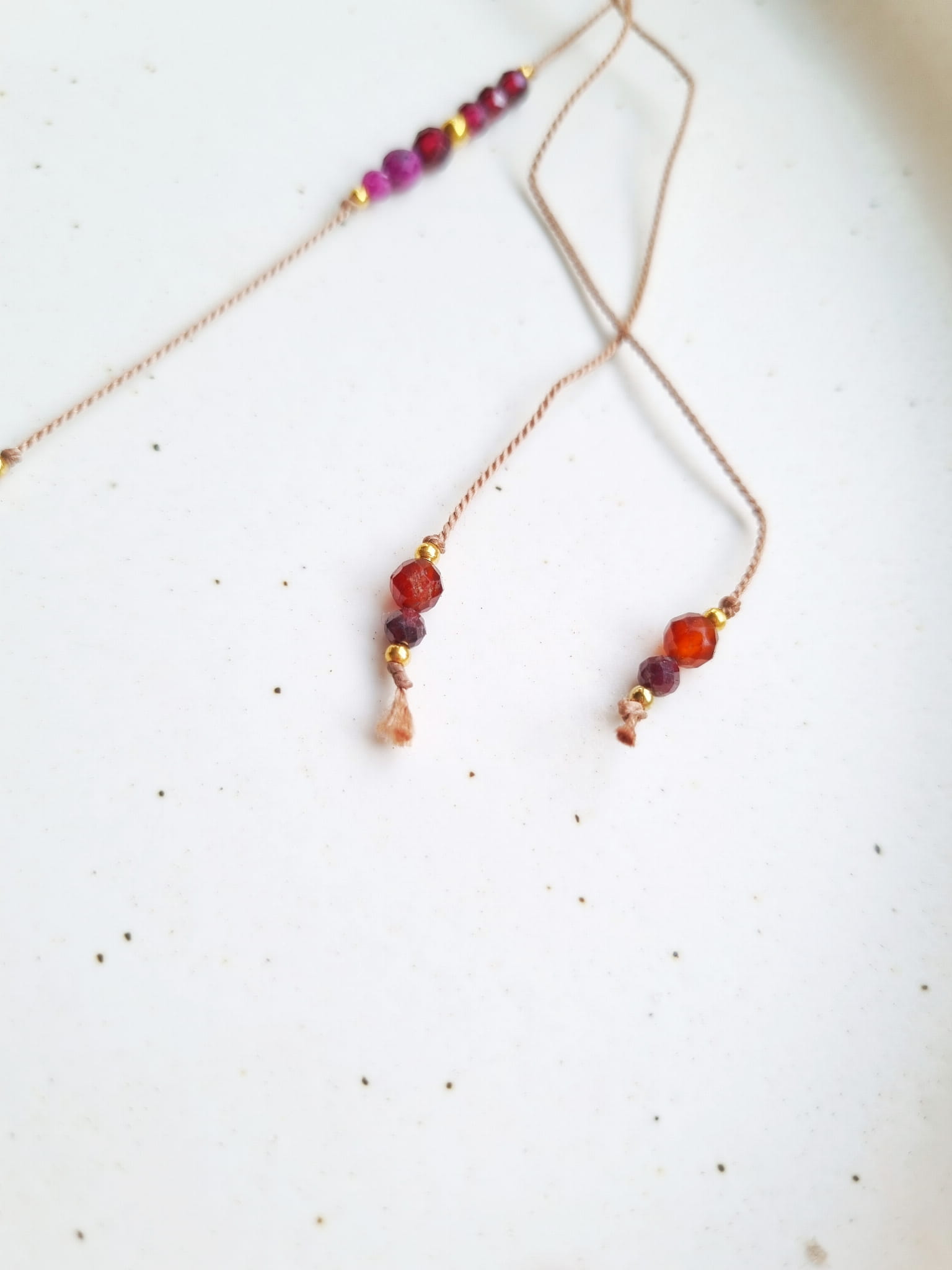 Nawleczony na beżowej nici jedwabnej.